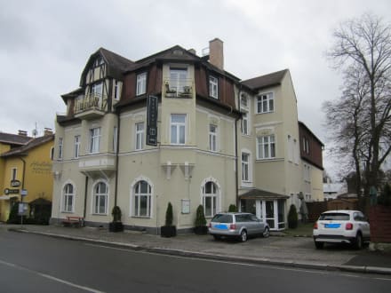 Außenansicht des Hotels DaVinci in Marienbad mit den gerade mal 3 Parkplätzen am Haus.