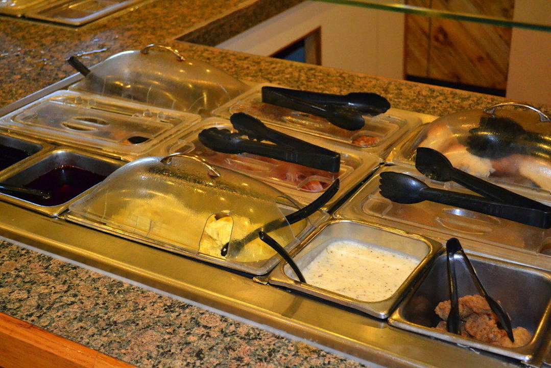 Warmes Frühstück, bestehend u.a. aus Biscuits and Gravy, Beans, Bacon und Eggs