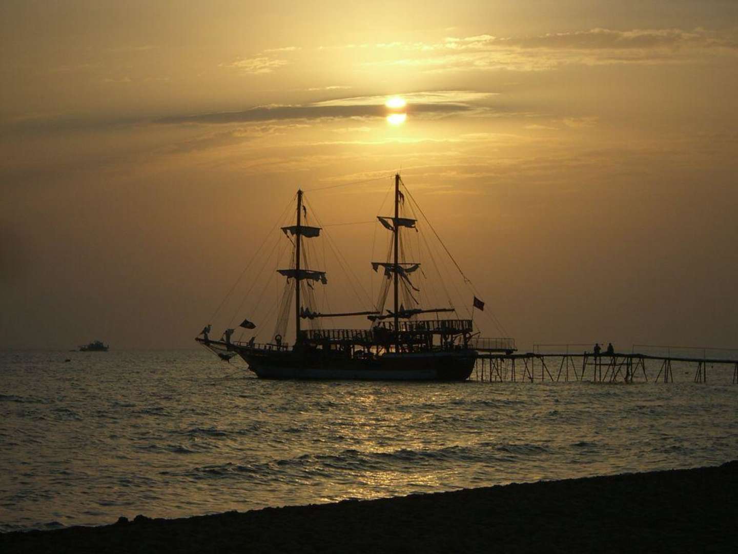 Sonnenuntergang mit Schiff, welches täglich am Steg anlegt