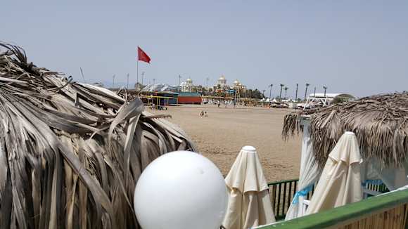 Blick von der Seebrück über den Strand zum Delphin Be Grand Resort Hotel