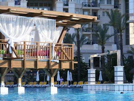 Blick über den Hauptpool, links Steg mit Liegen Hotel Delphin Diva