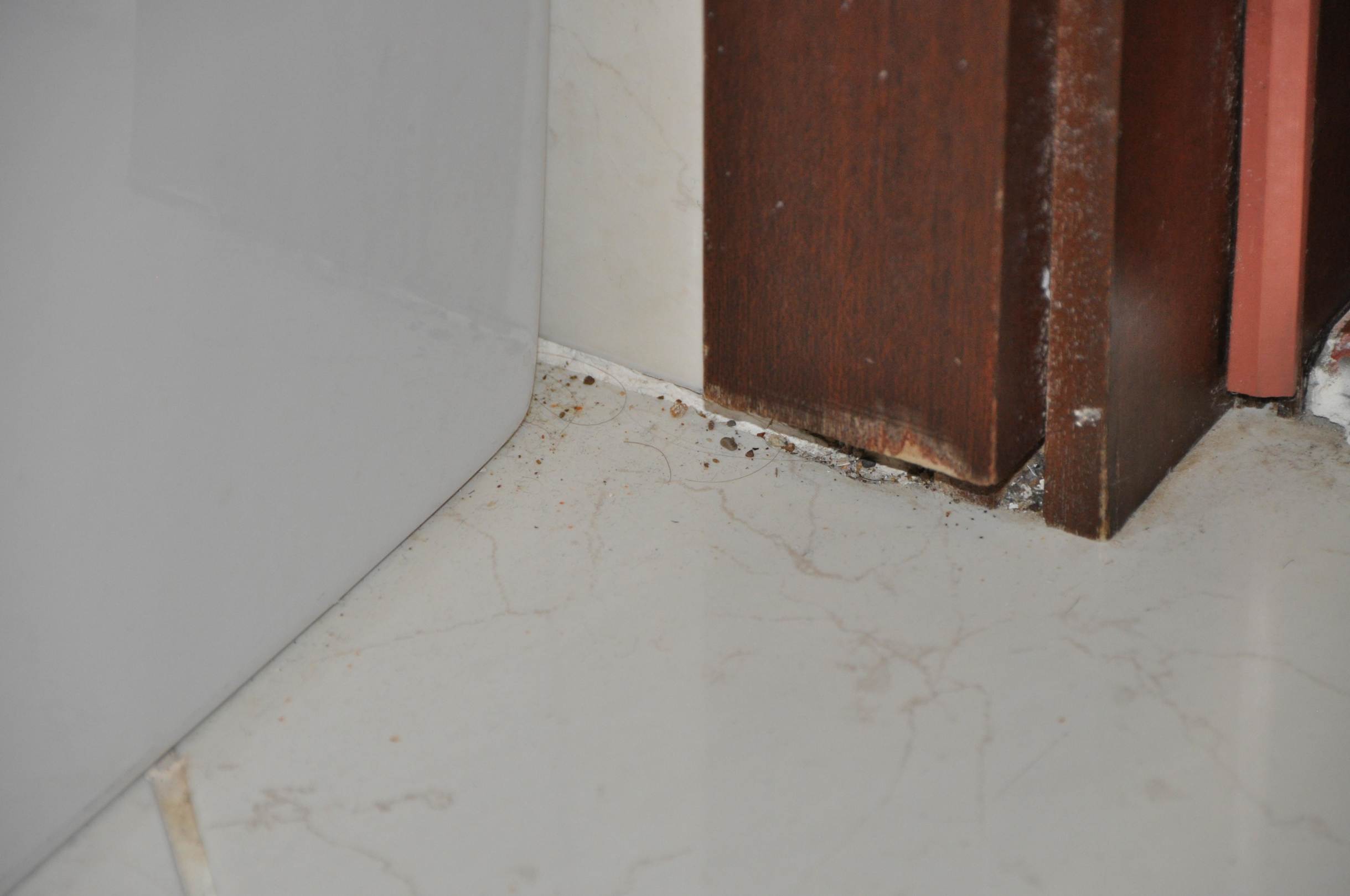 Eingangsbereich, unterer Bereich Türrahmen und Badewannenverkleidung, mangelhafte Sauberkeit