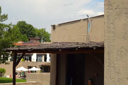 Außenansicht- die Holzdächer über den Balkonen, Eingängen und Terrassen machten einen sehr desolaten Eindruck
