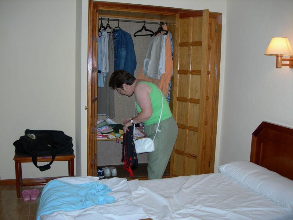 Rechts neben dem Fotografen steht das 2 Bett, im Rücken die Balkontür, linker Hand an der Wand das TV daneben der Frisiertisch mit Spiegel und geradeaus gehts Richtung Badezimmer und Aussentür.