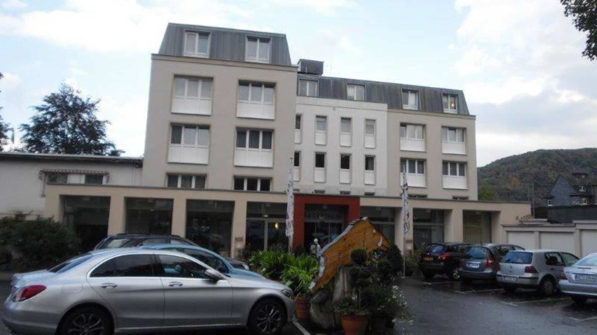 Blick zum Eingang vom Parkplatz