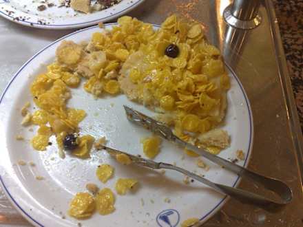 Ein Kuchen mit Cornflakes :-)) Weil ich so ein Kuchen noch nie gesehn habe, habe ich natürlich ein stückchen probiert. Leider haben die Cornflakes die Flüssigkeit vom Kuchen aufgenommen und sind daher nicht mehr knusprig.