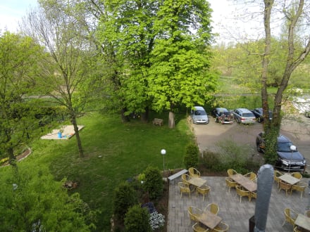 Terrasse, Gartenanlage und Parkplatz