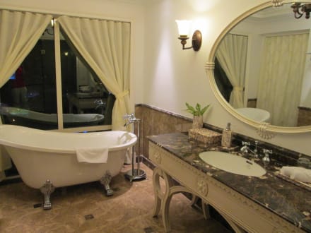 Von der Badewanne aus hatte man Blick zur Stadt. Die zusätzliche Dusche ist nicht sichtbar