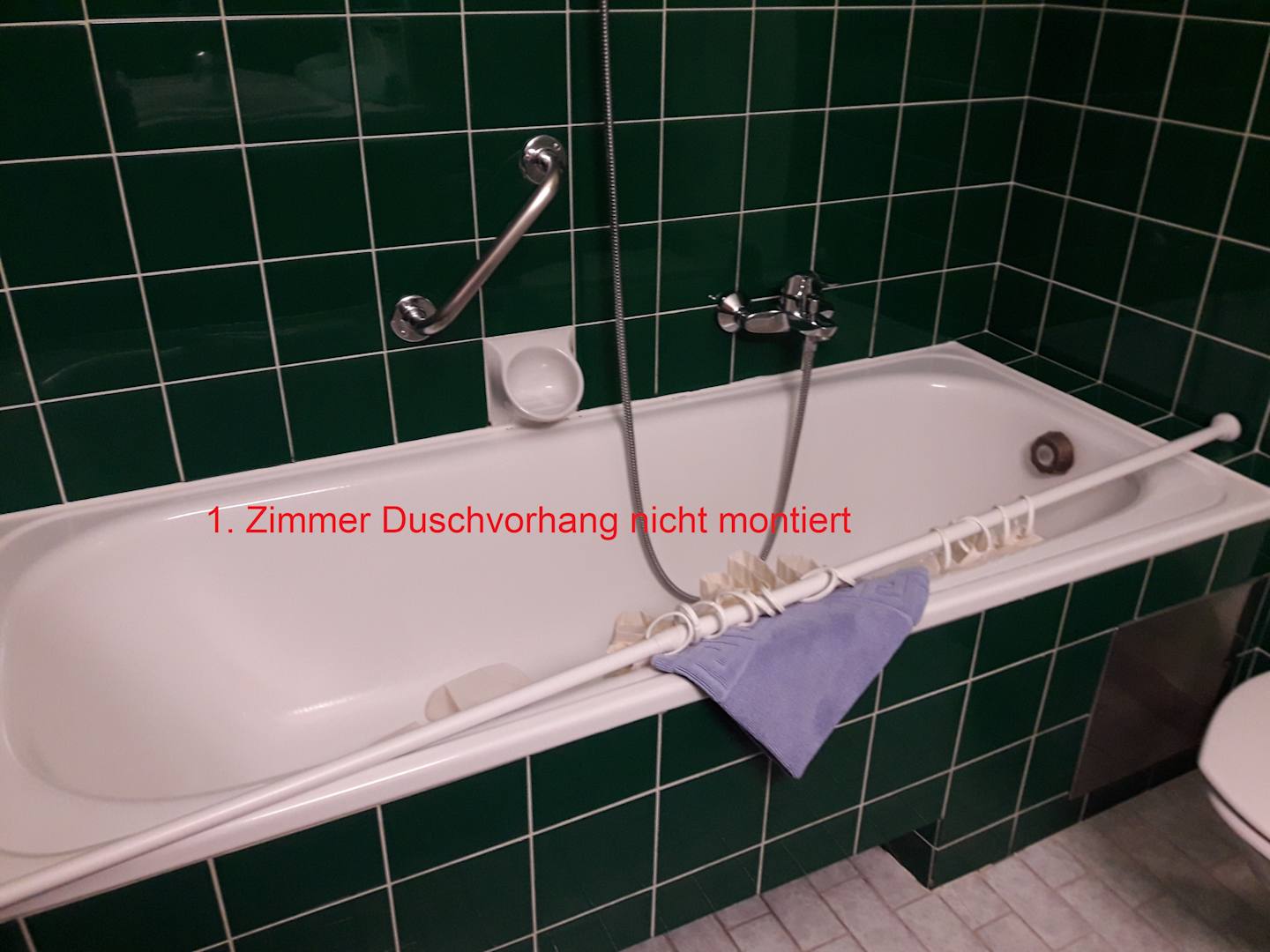 Im ersten Zimmer 109, das uns zugewiesen wurde, war der Duschvorhang nicht montiert