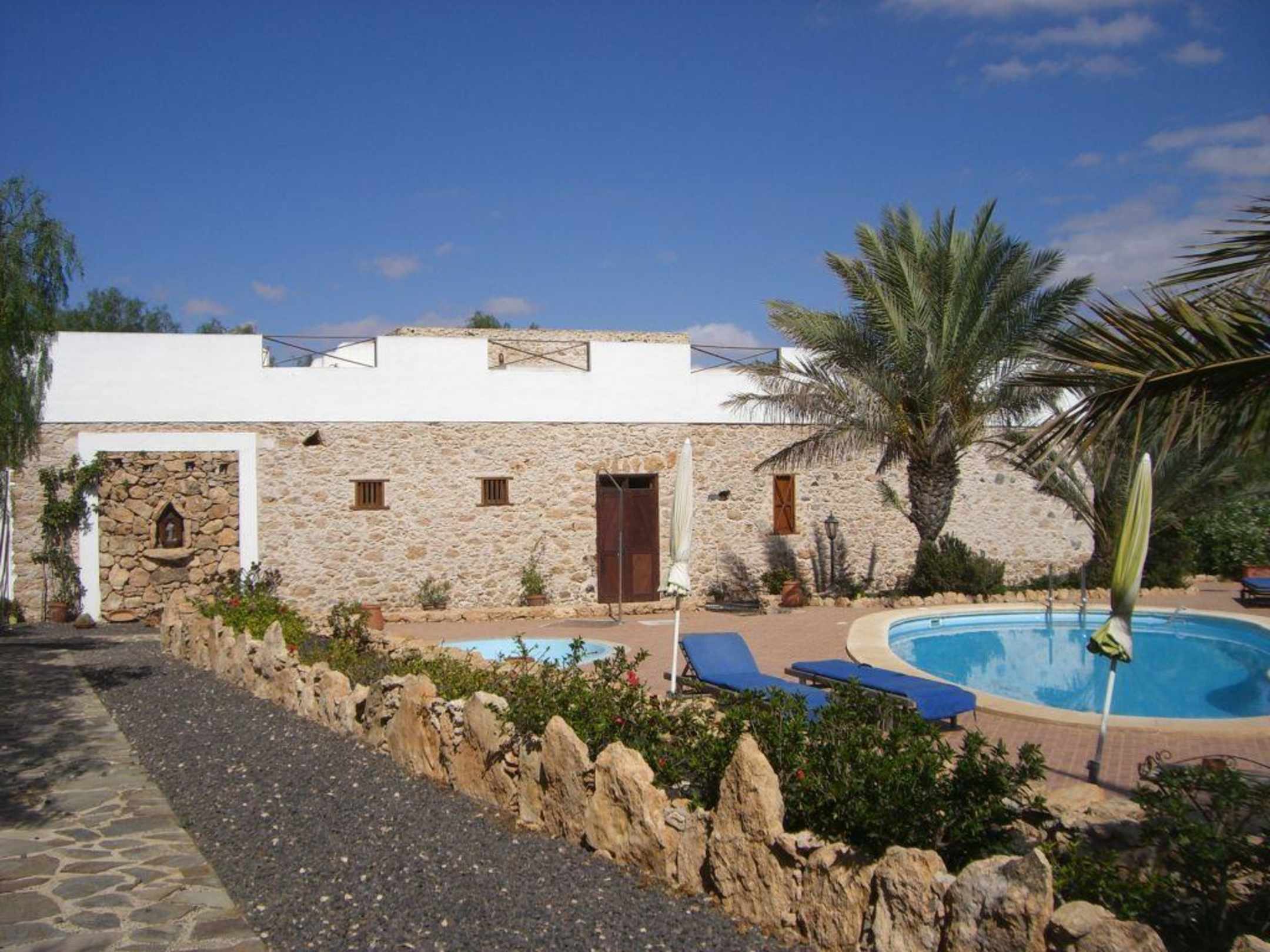 Blick vom Innenhof auf Hotel und Pool