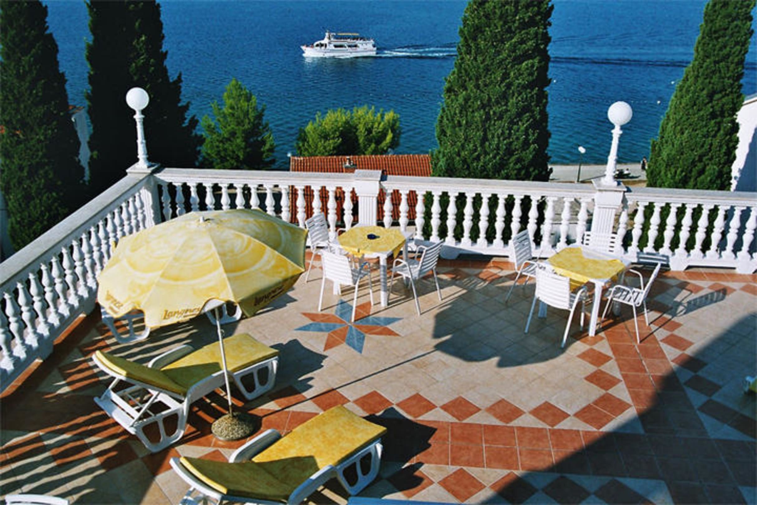 Der beeindruckende Ausblick von der obersten Terrasse des Hotels bietet Sicht bis auf die gegenüberliegende Insel Krk. Tische/Stühle und Schirme/Liegen gab es kostenlos.