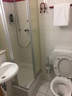 Kleines Waschbecken mit sehr enger Duschkabine, die für etwas korpulentere Gäste nicht nutzbar ist