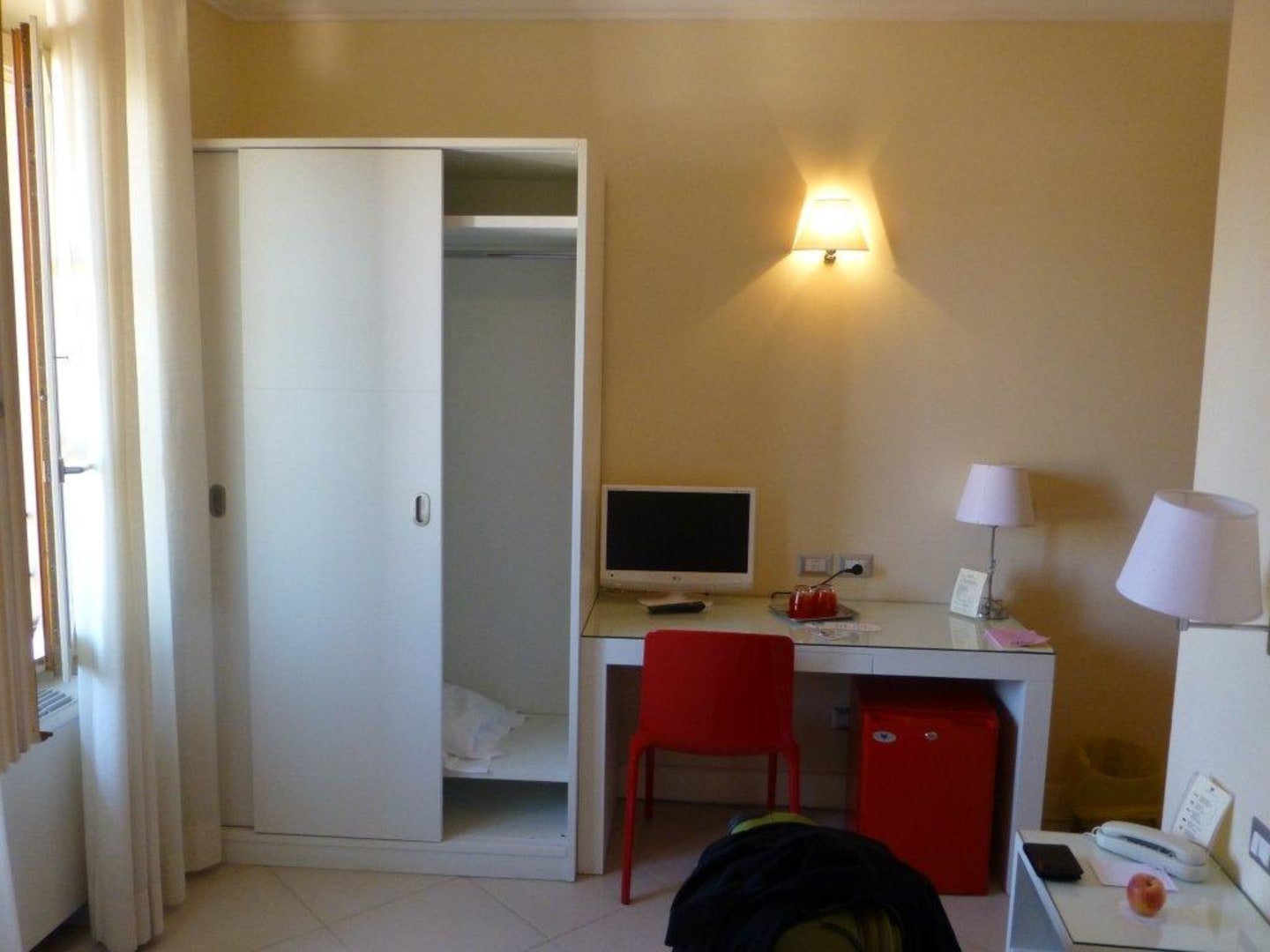 Eher kleiner Kasten aber genügt für 3-4 Tage zu zweit. Schreibtisch mit Flat-TV und vielen ital. Sendern. Der kleine rote Kühlschrank unter dem Tisch ist eine wunderbare Zimmerausstattung.