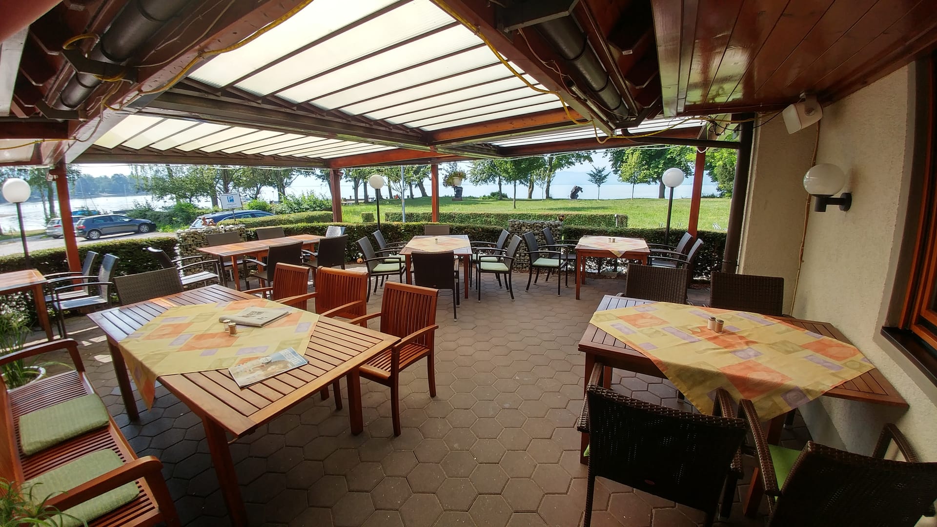 Außenterrasse des Restaurants mit Blick auf Park und See