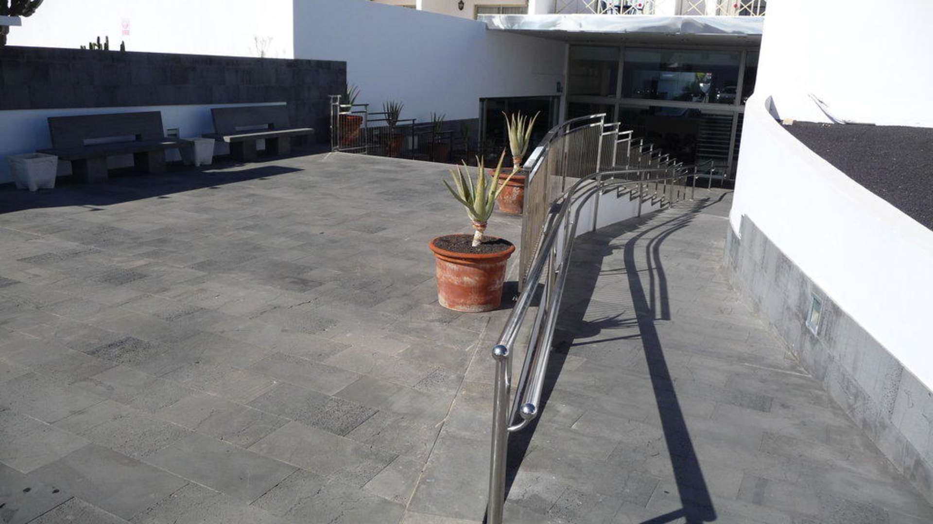Der Eingang mit Rampe, für Koffer gut, für den Rollstuhl machbar