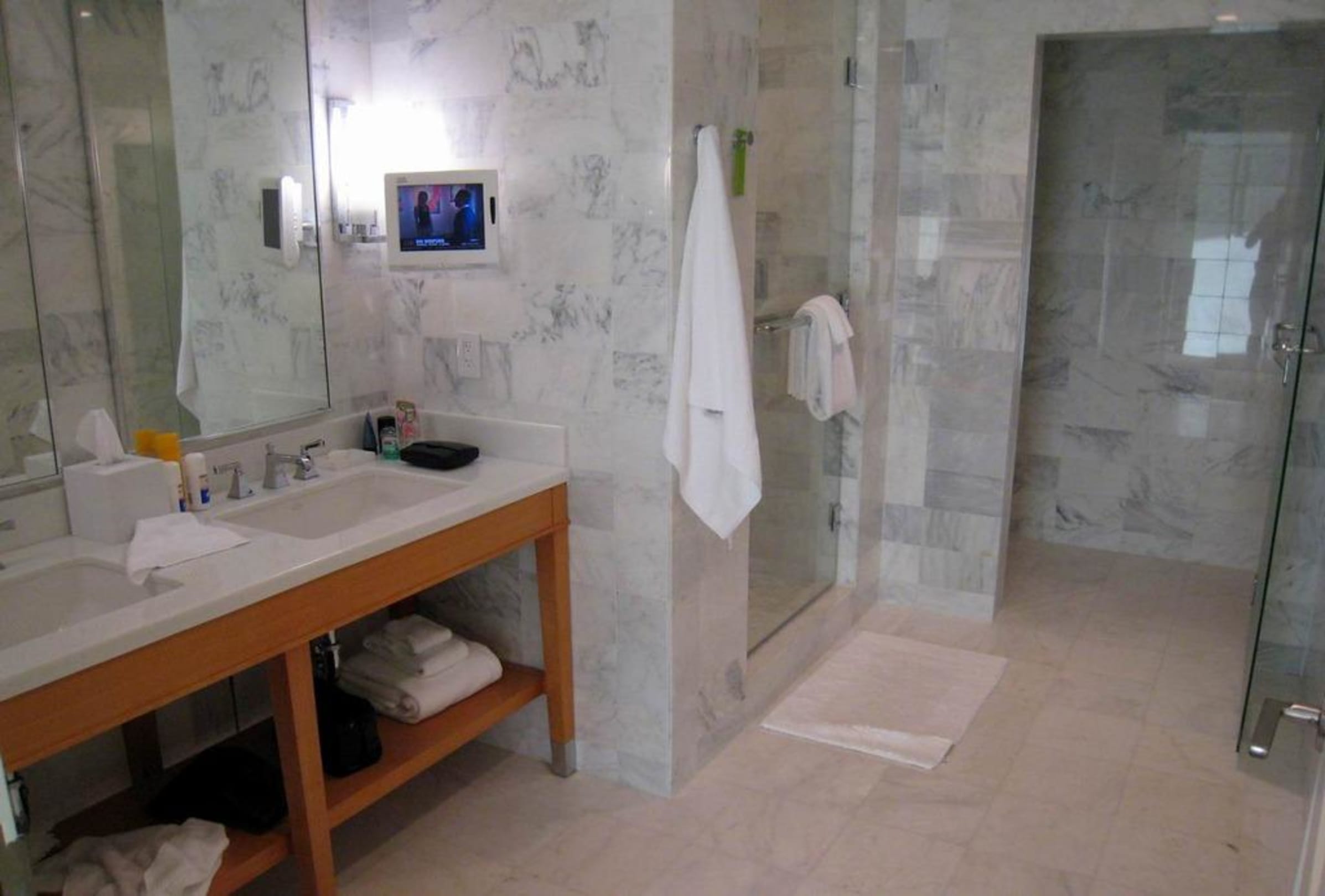With a small television, but no bathtub.
