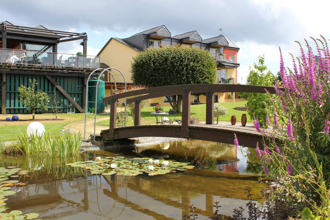 Schöne Teichanlage mit Brücke im Aussenbereich