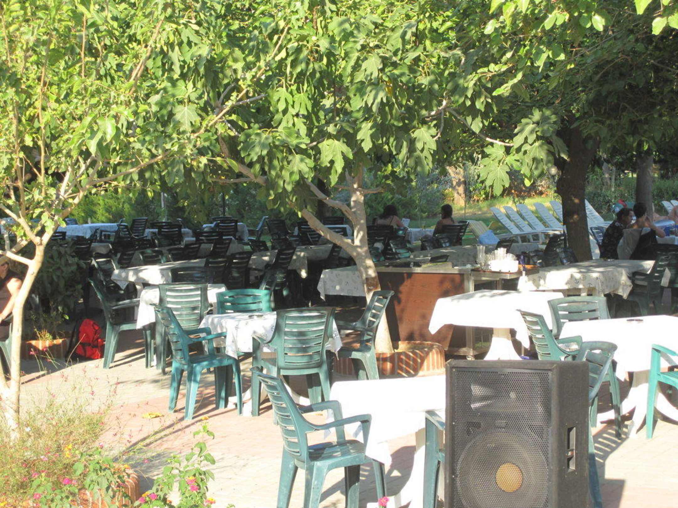 StrandbarSitzbereich der Strandbar unter Feigen- und Gummibäumen. Angenehmer Schattenspender in der Mittagshitze