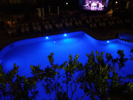 Blick aus dem Restaurant auf den Ruhepool und die Animationsbühne