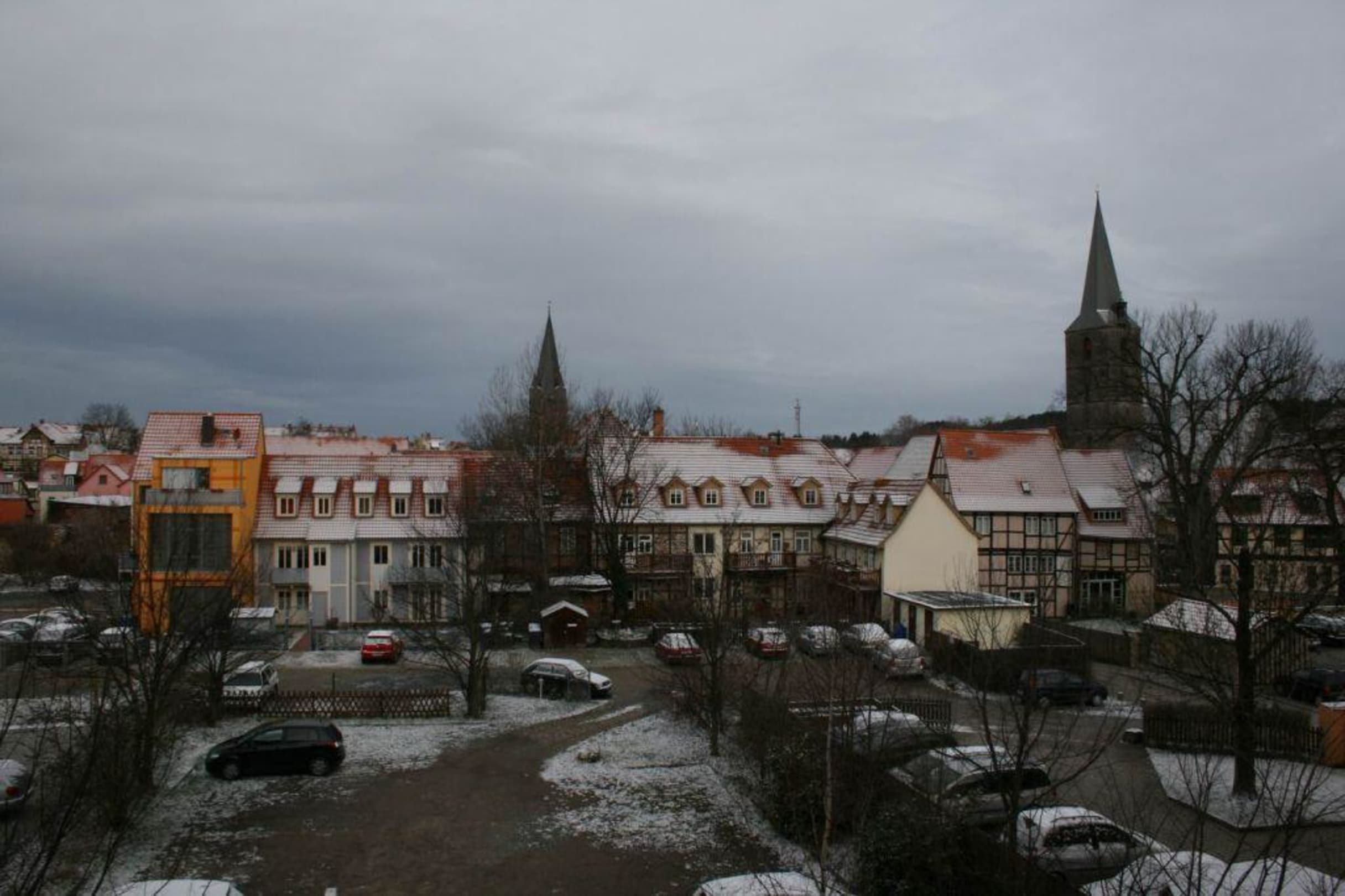 Ende März waren die Dächer noch einmal leicht gepudert. Blick auf die Parkplätze