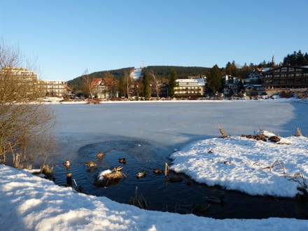 Blick aufs Hotel über den vereisten See