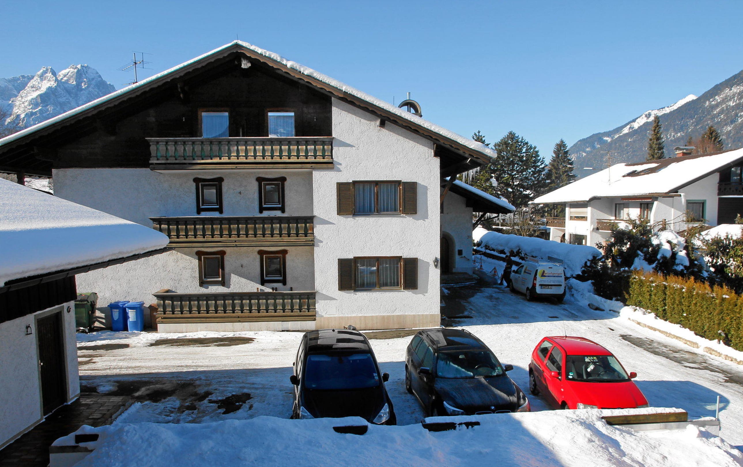 Blick vom Balkon zum Haupthaus und Zugspitze