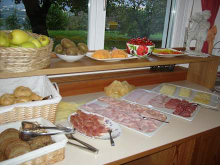 Teil des leckeren Frühstücksbüffets (es hatten sich schon Leute bedient, wurde gut wieder aufgefüllt), grosser Korb mit verschiedenen Brötchen passte nicht mehr aufs Bild