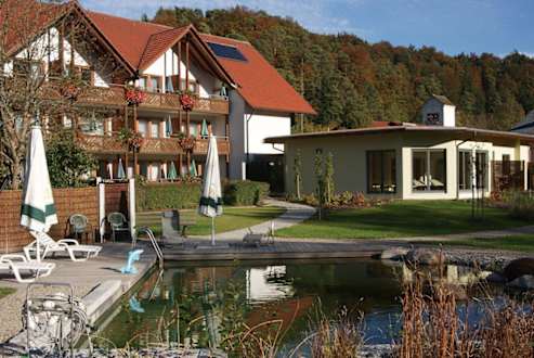 Wellnessbereich und Nebengebäudeim Vordergrund das Naturschwimmbecken, rechts der Saunabereich, links das Nebengebäude