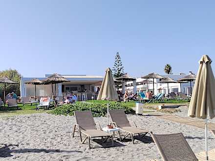 Blick vom Strand zum Liegebereich vom Hotel und der Poolbar