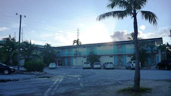 Sonnenaufgang hinter den ZimmernBlick über den Parkplatz zu dem Zimmerbereich während des Sonnenaufganges
