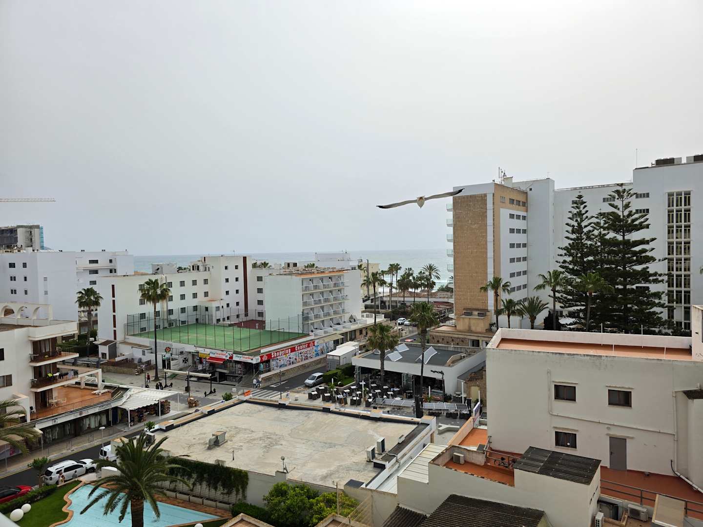 Ausblick vom Balkon Suite Nr. 624. Meerblick leicht eingeschränkt durch andere Hotels.