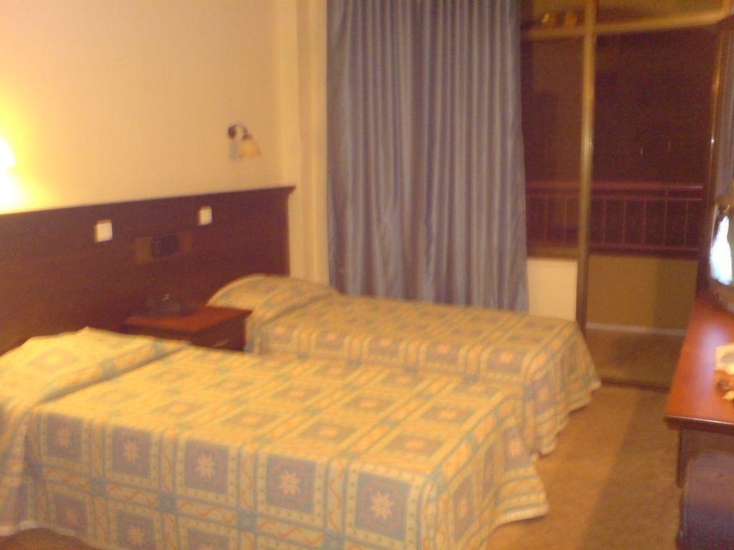 Ansicht des ZimmersDas Zimmer war recht schön, mit Teppichboden. Hinter dem Vorhang blätterte allerdings Putz von der Decke.