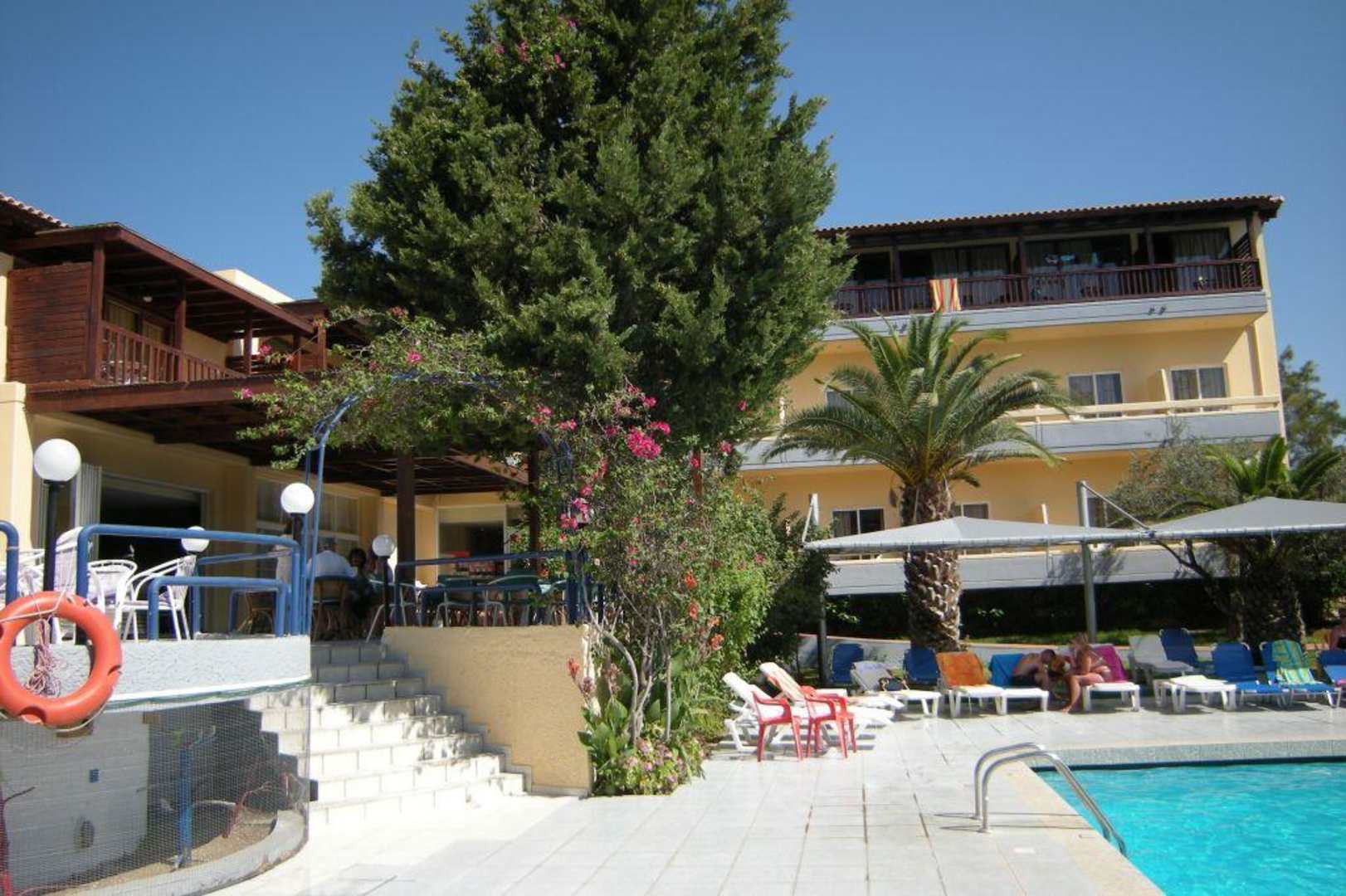 Blick auf das Haupthaus von der PoolseiteLinks die Treppe hoch zur Bar und Rezeption. Rechts ein Teil des Pools
