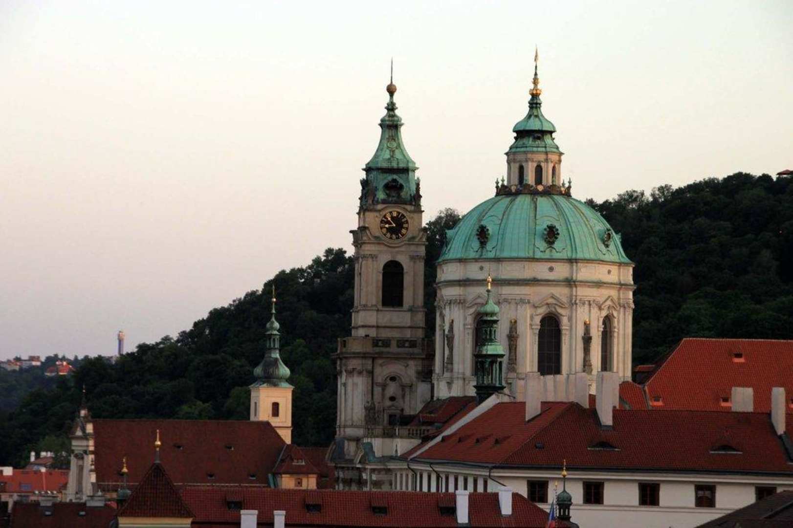 Nikolauskirche in der Dämmerung von der Hotelterrasse