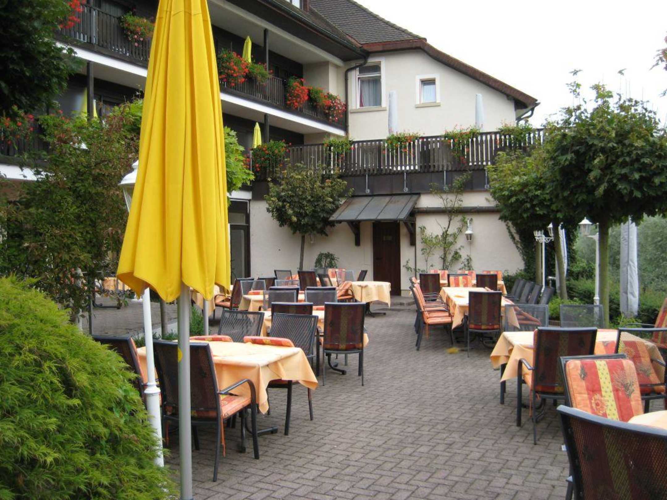 Blick auf die Rheinterrasse am Hotel rückseitig.