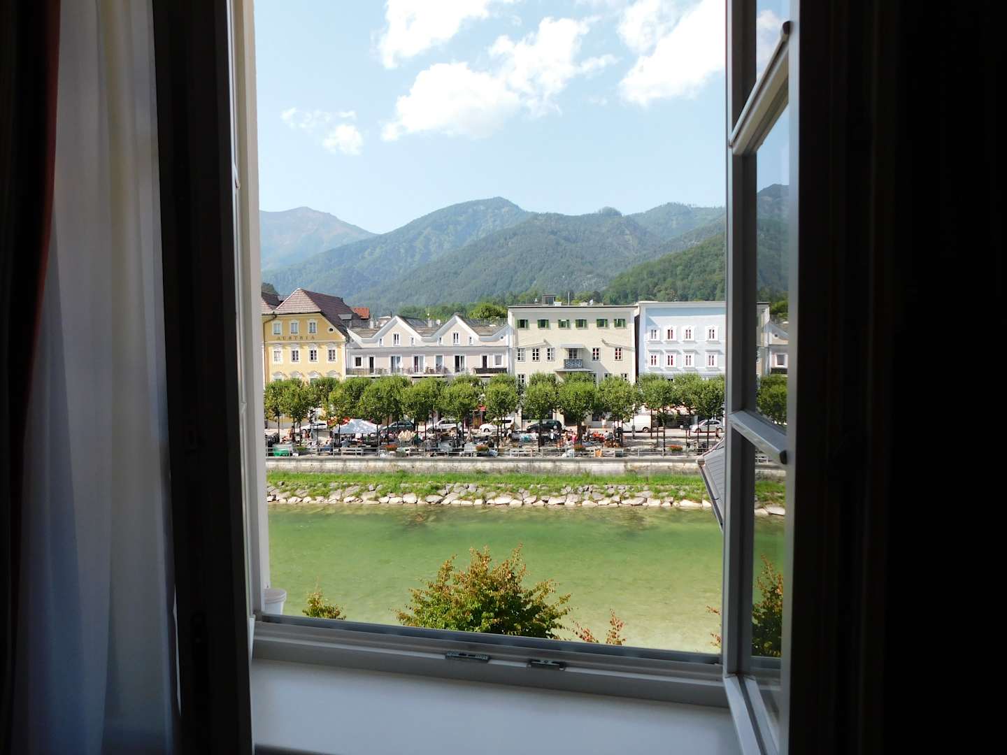 ZimmerBlick aus unserem Zimmer. Gleich gegenüber der Traun die Esplanade, wo der Lärm bis spät in die Nacht herrscht. Die Häuser dort reflektieren den Schall extrem stark herüber. Gleich rechts die Kaiserin-Elisabeth-Brücke, wo der ganze Verkehr rollt.