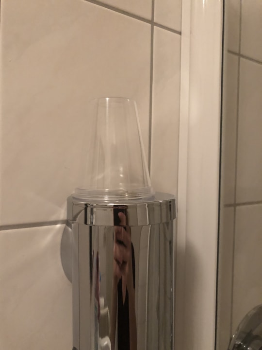 Plastik-Zahnputzbecher aus dem Spender, nachdem man Nachhaltigkeit bei der Handtuchnutzung anpreist..