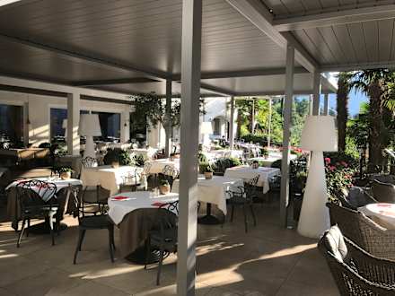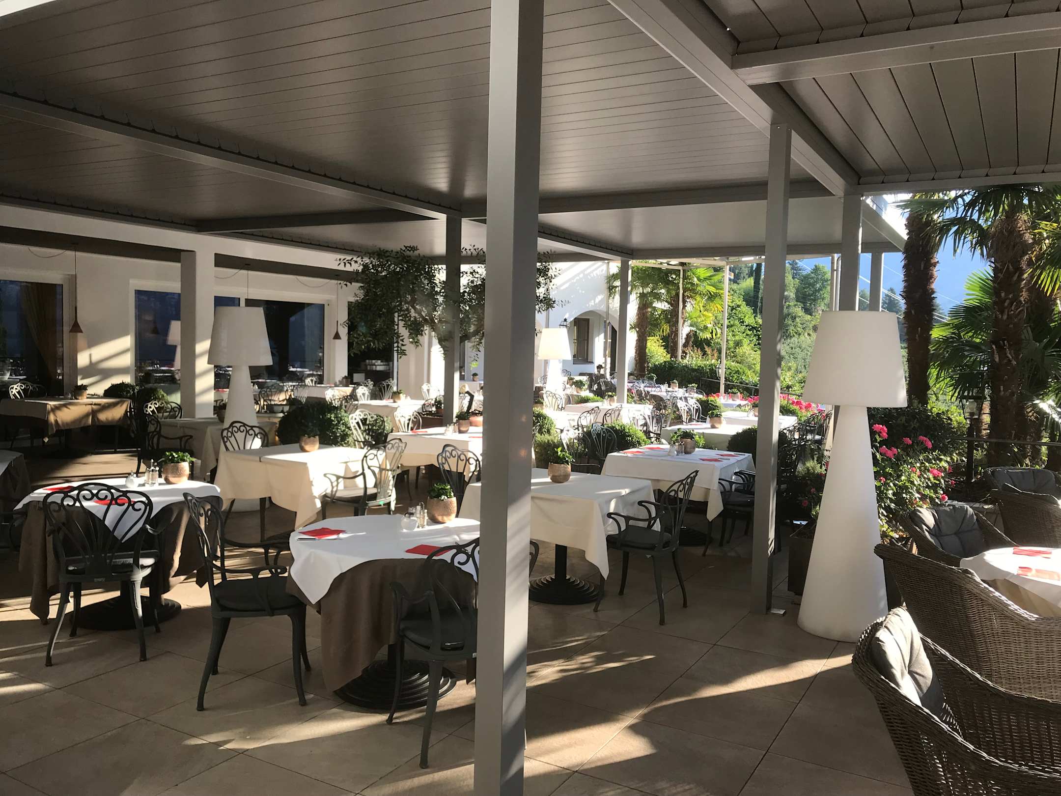 Gastrogut überdachte Terasse, so dass man bei einem Regenschauer nicht gleich flüchten muss (kann elektrisch geöffnet werden)