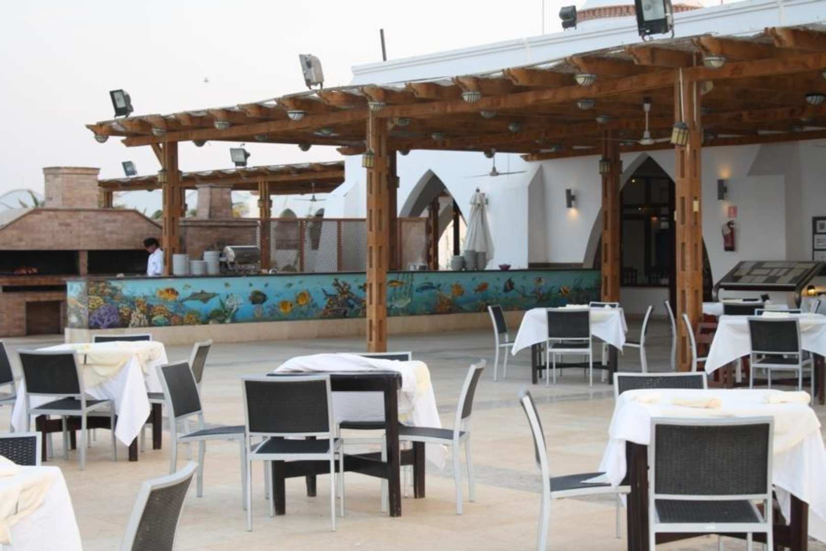 Hauptrestaurant mit Blick auf Pasta-Live-Cooking