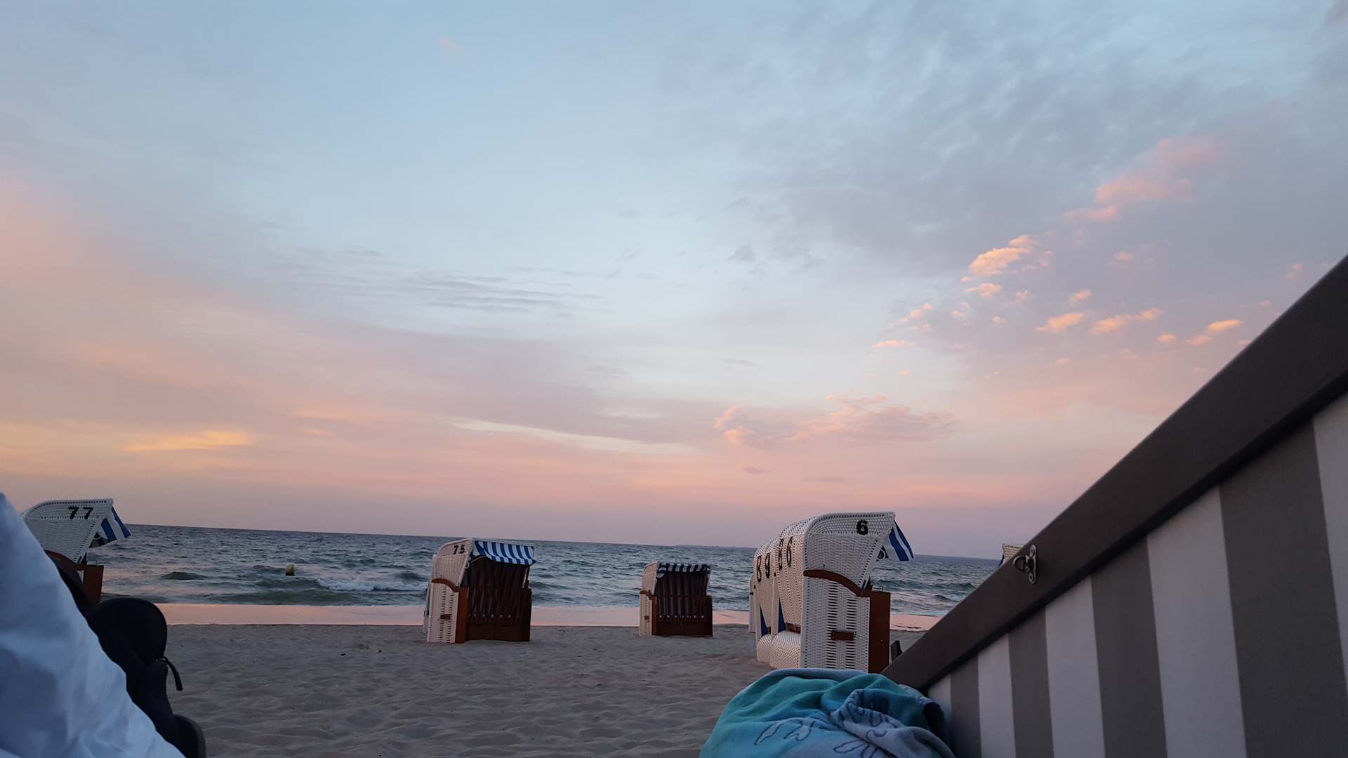 Blick liegend aus dem Schlafstrandkorb am Abend.