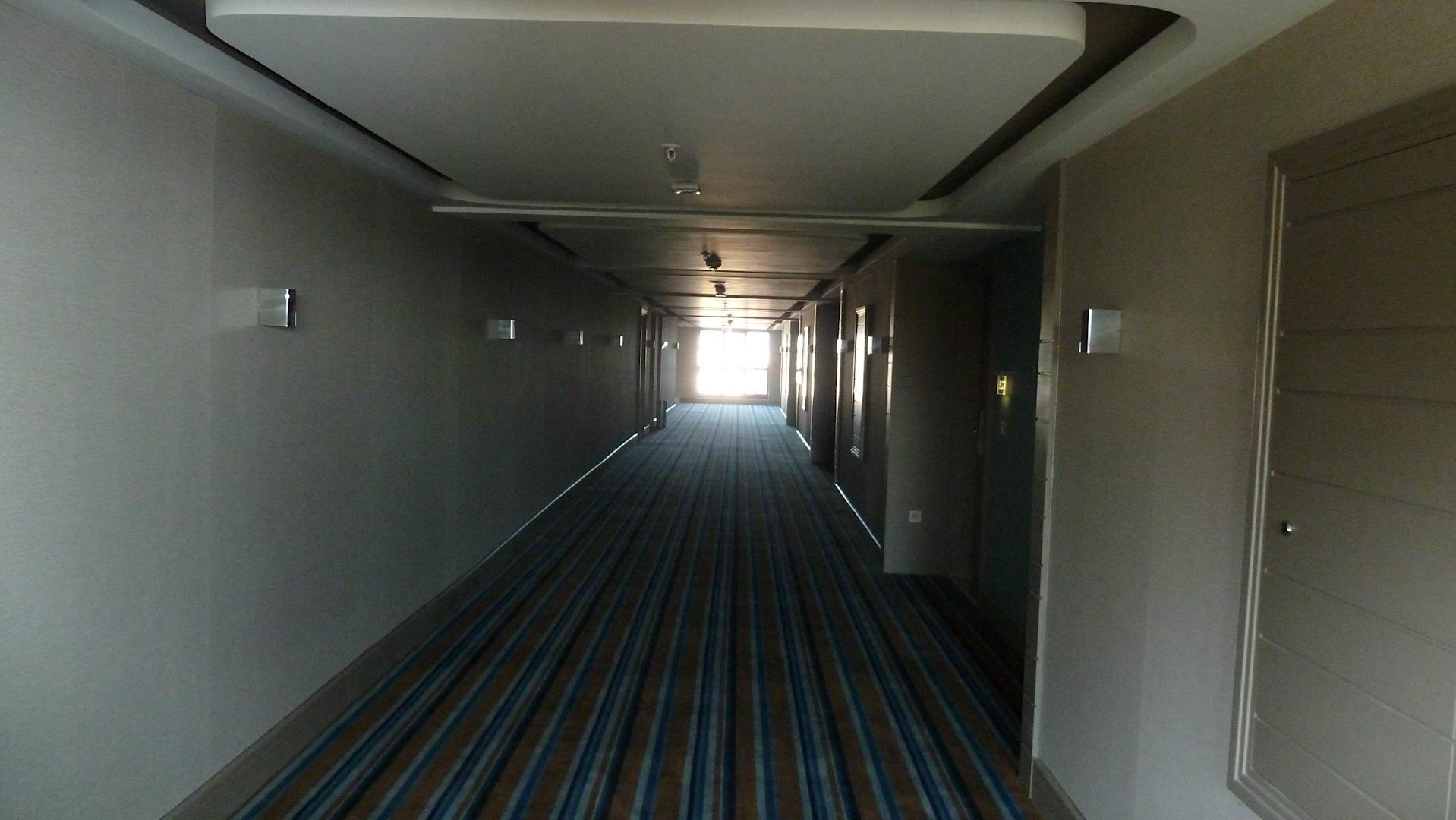 Hotelflur, neu: mit Klingel an jeder Zimmertür