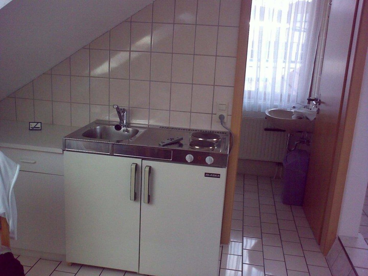 Im Zimmer ein Kühlschrank, Kochplatten und eine Spüle.