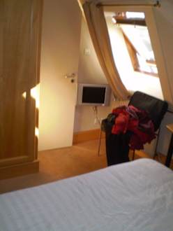 Blick zum Eingang des Bades. LCD-TV in Kniehöhe. Schreibtisch nur eingeschränkt nutzbar, da sich der Stuhl bautechnisch bedingt nicht voll verschieben lässt.