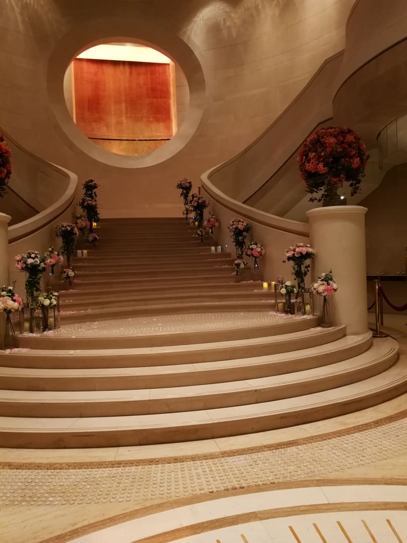 Stiegenaufgang und meist spielt vor der Teilung der Treppen eine Harfenspielerin