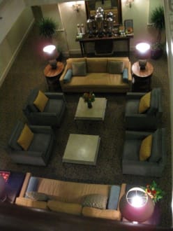 Atrium Lobby im HarbourView Inn in Charleston, South Carolina: hier gibt's nachmittags Wein mit Käse, morgens kann man hier auch frühstücken (Alternativ im Zimmer oder auf der Rooftop Terrace)