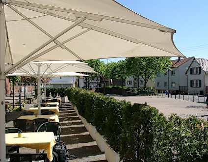 Restaurant AußenbereichRestaurant des Harheimer Hofes. Hier sitzt man schön am Markt von Altharheim und kann lecker essen.