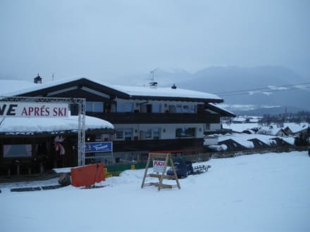 Im Vordergrund ist die Aprés-Ski-Tenne zu sehen, im Hintergrund das Hotel Heinz mit den Zimmern, die Richtung Berg zeigen. Links hinter dem Hotel befindet sich die Talstation.