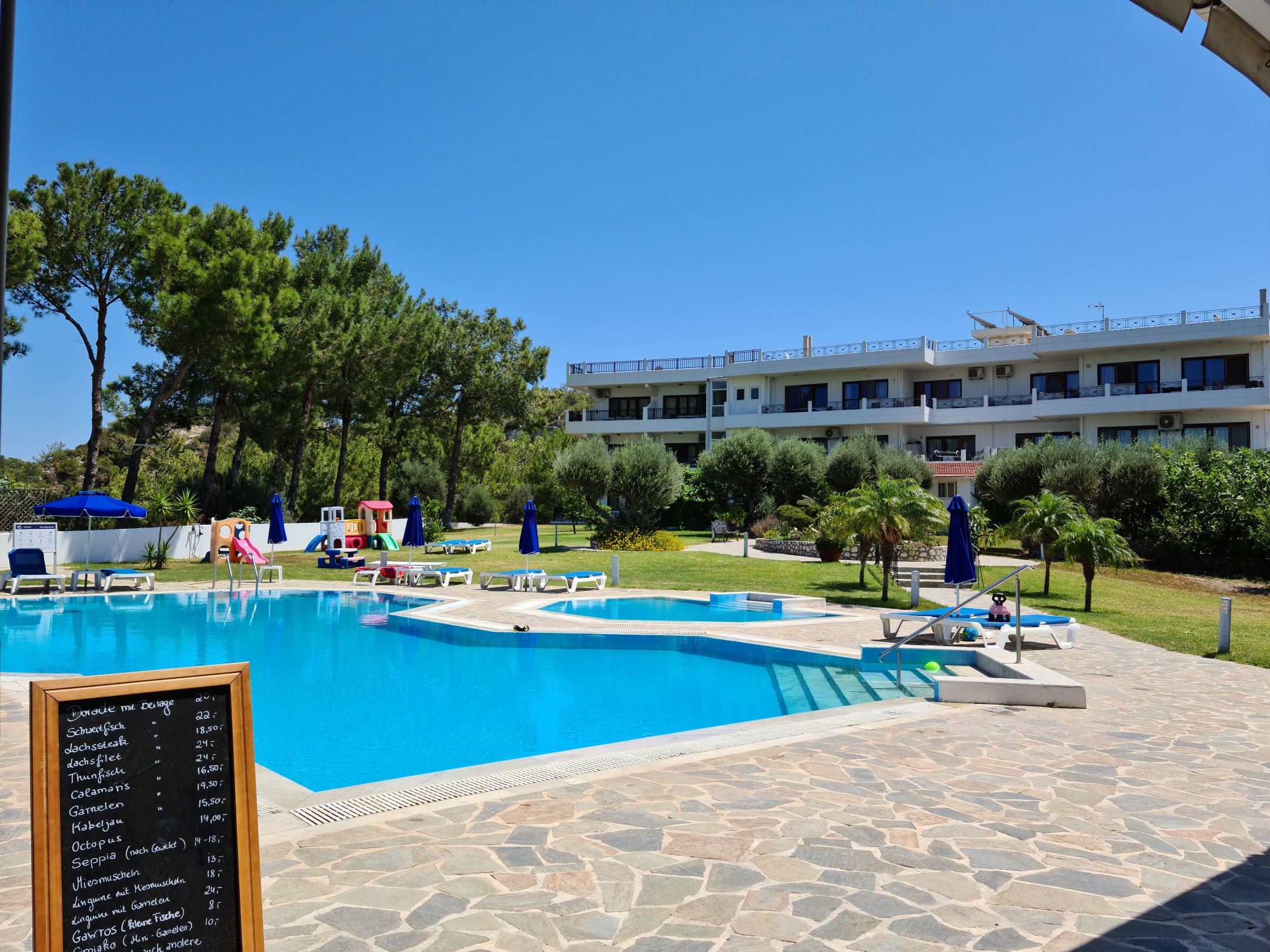 Pool mit Südansicht des Holtels