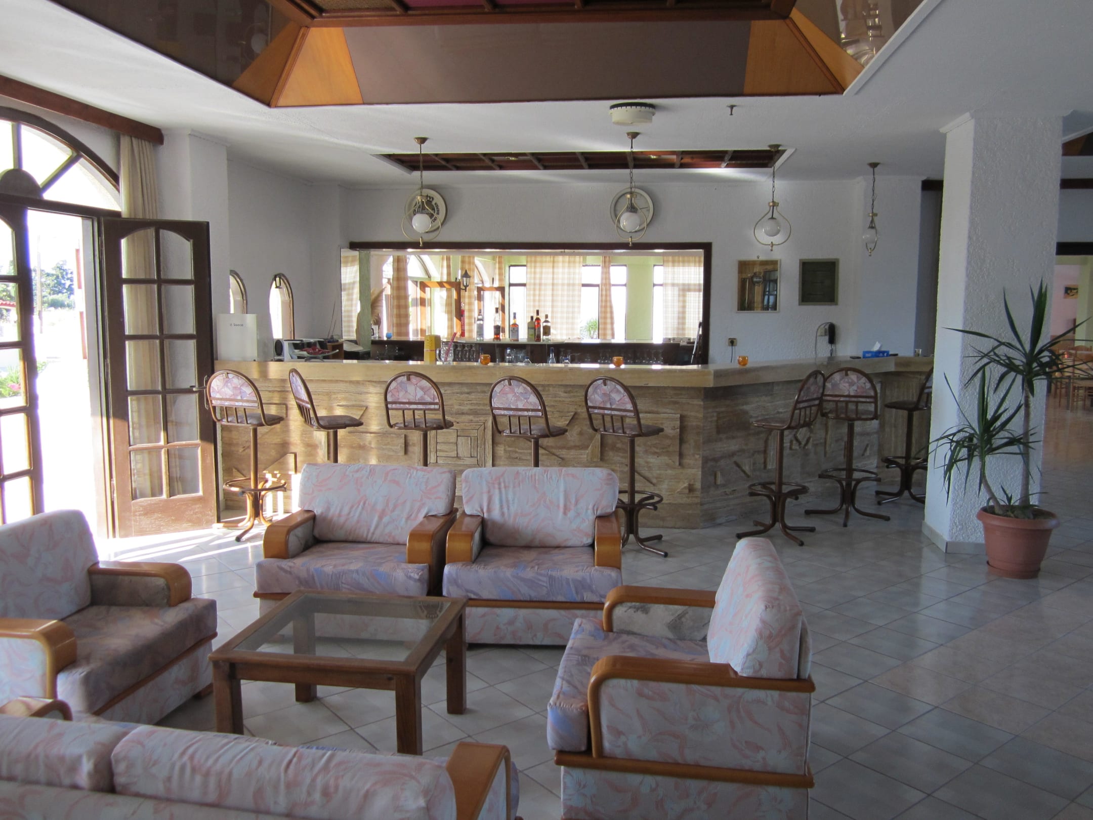 Im Hintergrund die Bar bietet Möglichkeiten für preiswerte Drinks oder Frappés. In den gemütlichen Sesseln lässt es sich gut lesen oder auch fernsehen (Sat-Anlage) auf der rechten Seite (nicht im Bild).