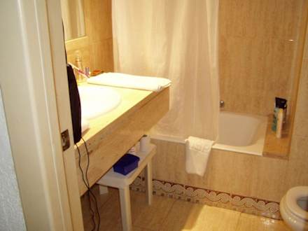 Badezimmer im Seitentrakt des Hotel Hispania, links Waschbecken (hier befindet sich auch der Fön), hinten Badewanne von ca. 1m Länge mit Duschvorhang, rechts Toilette. Badezimmer für 2 Pers. gleichzeitig zu klein!